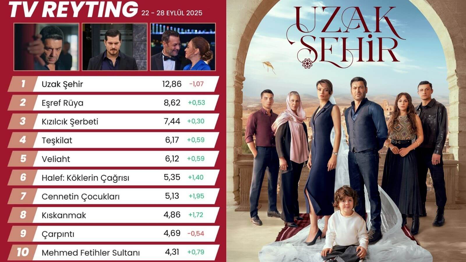 Haftanın en çok izlenen dizisi unvanı tekrar Uzak Şehir’in! 12.86 reytingle tahtını koruyan üretim, -1.07’lik hafif bir düşüşe karşın rakiplerini geride bırakmayı başarıyor. Arkadaşlar, toplumsal medyada Uzak Kent için binlerce yorum yağarken, hayranları her kısmı merakla bekliyor.