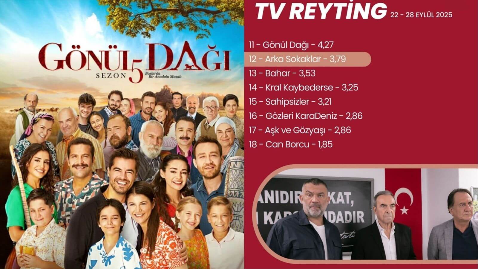 Alt sıralarda drama bitmiyor: Gönül Dağı 4.27’yle 11. sıraya yerleşti, Art Sokaklar 3.79’la 12’nci, Bahar ise 3.53’te 13. Kral Kaybederse 3.25, Sahipsizler 3.21, Gözleri Kara Deniz ve Aşk ve Gözyaşı 2.86’yla başa baş gidiyor. En tabana vuran ise Can Borcu; yalnızca 1.85 reytingle 18. sırada yer alıyor. İzleyiciler “Can Borcu neden düşüyor” diye veryansın ederken, Mehmet Fetihler Sultanı +0.79’la 4.31’de toparlandı.